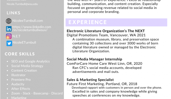 I graduated from Washington State University Vancouver Spring 2021 with a dual-degree in Digital Technology & Culture and Integrated Strategic Communications. My superpowers in the field, as we call them in DTC, are social media and multimedia design.
